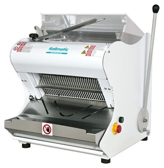 Настольная полуавтоматическая хлеборезка Rollmatic G 42-C предназначена для нарезки формового хлеба с коркой средней твердости на равные ломтики на предприятиях общественного питания и торговли. Модель оснащена электроприводом режущего полотна с кнопочным выключателем. Корпус выполнен из стали с антикоррозийным покрытием порошковой краской, лезвия режущего полотна – из стали, толкатель – из нержавеющей стали.