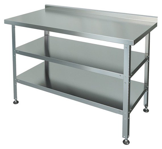 Производственный стол Марихолодмаш СРП-1-0,8/1,2-2П предназначен для раскатки теста и обработки ингредиентов для приготовления блюд, а также может использоваться в качестве дополнительного места для установки кухонных приборов на предприятиях общественного питания и торговли. Рабочая поверхность, усиленная ЛДСП толщиной 15 мм, выполнена из нержавеющей стали AISI 430 толщиной 0,5 мм, полки - из нержавеющей стали AISI 430, ножки с регулируемыми опорами - из уголка 40х40 мм из оцинкованной стали толщиной 1 мм с подгибом краёв вовнутрь.