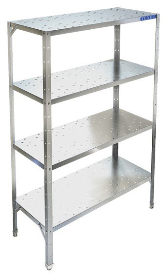 Кухонный стеллаж Техно-ТТ СТР-424/1203 предназначен для хранения посуды, различного инвентаря и сухих продуктов на предприятиях общественного питания и торговли. Модель оснащена регулируемыми по высоте полками и ножками, что позволяет компенсировать неровности пола. Разборный каркас выполнен из уголка 40х40 мм из нержавеющей стали AISI 430 толщиной 2 мм, перфорированные полки - из нержавеющей стали AISI 304.