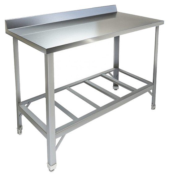 Производственный стол KAYMAN СП-255/1208 используется на предприятиях общественного питания и торговли для раскатки теста и обработки ингредиентов для приготовления блюд, а также как дополнительное место для установки и хранения кухонных приборов, инвентаря и сухих продуктов. Модель оснащена полкой-решеткой и плоским бортом. Каркас изготовлен из оцинкованного уголка толщиной 1,5 мм, решетка из оцинковки, толщиной 0,8 мм, столешница - из нержавеющей стали AISI 430, толщиной 0,8 мм, усиление ЛДСП 16 мм.