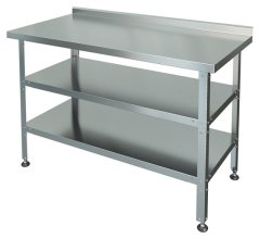 Производственный стол Техно-ТТ СП-811/700 предназначен для разделки и обработки пищевых продуктов, а также для расстановки и хранения посуды и кухонного инвентаря на предприятиях общественного питания и торговли. Модель оснащена регулируемыми по высоте ножками, что позволяет компенсировать неровности пола. Разборный каркас выполнен из конструкционного профиля-уголка 40x40x2 мм, покрытого серой порошковой краской, полка-решетка - из крашенного металла, столешница - из нержавеющей стали AISI 430.