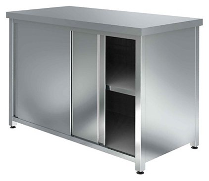 Производственный стол Assum СПК-С-12/7 серии Стандарт предназначен для раскатки теста и обработки ингредиентов для приготовления блюд, а также хранения посуды и кухонного инвентаря на предприятиях общественного питания и торговли. Модель оснащена прямоугольной столешницей, тумбой с дверьми-купе и промежуточной сплошной полкой. Опоры выполнены из углового профиля из оцинкованной стали, столешница и двери – из высококачественной нержавеющей стали AISI 430, боковые стенки, дно, двери и полка – из оцинкованной стали, подпятники опор – из прочного пластика.