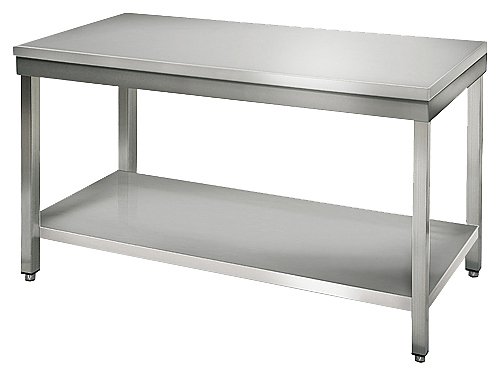 Производственный стол Kocateq SAT126 предназначен для раскатки теста и обработки ингредиентов для приготовления блюд, хранения посуды и кухонной утвари на предприятиях общественного питания и торговли. Столешница выполнена из нержавеющей стали AISI 304 толщиной 1 мм, усилена вкладкой из ДСП с ламинированием открытой сторон, каркас и полка - из нержавеющей стали AISI 201, ножки - из трубы квадратного сечения 40x40 мм, пятки - из пластика.