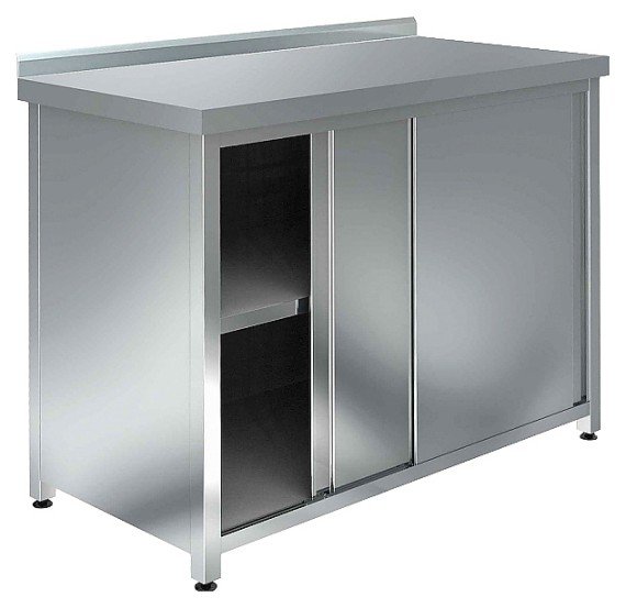 Производственный стол Assum СПКБ-С-18/6 серии Стандарт предназначен для раскатки теста и обработки ингредиентов для приготовления блюд, а также хранения посуды и кухонного инвентаря на предприятиях общественного питания и торговли. Модель оснащена прямоугольной столешницей с бортом, тумбой с дверьми-купе и промежуточной сплошной полкой. Опоры выполнены из углового профиля из оцинкованной стали, столешница и двери – из высококачественной нержавеющей стали AISI 430, боковые стенки, дно, двери и полка – из оцинкованной стали, подпятники опор – из прочного пластика.