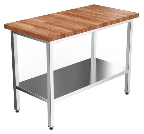 Кондитерский стол EKSI СКонП-1500/700-п используется на предприятиях общественного питания и торговли для разделки и обработки пищевых продуктов, а также для расстановки и хранения посуды и кухонного инвентаря. Модель оснащена ножками, регулирующимися по высоте и полкой. Разборный каркас выполнен из нержавеющей трубы AISI 430 40х40 мм, столешница - из бука.
