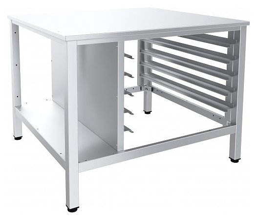 Подставка Пищевые Технологии ПКМ-5Р используется совместно с пароконвектоматами ПР-10М, ПР-10М-Э и конвекционной печью ПК-М-10-400/600. Модель оснащена регулируемыми по высоте ножками. Изделие выполнено из нержавеющей стали AISI430 толщиной 0.8 мм, каркас имеет сварную конструкцию из нержавеющей трубы 40х40 мм, столешница - из листового металла.