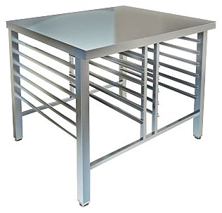 Подставка Техно-ТТ СПР-128/817 предназначена для установки на нее пароковектоматов Rational, а также для хранения гатсроемкостей на предприятиях общественного питания и торговли. Модель оснащена 2 рядами по 7 уровней направляющих под гастроемкости GN 1/1 и регулируемыми по высоте ножками, что позволяет компенсировать неровности пола. Разборный каркас выполнен из трубы 40х40 из нержавеющей стали AISI 304 толщиной 1,2 мм, столешница - из нержавеющей стали AISI 304 толщиной 1 мм.