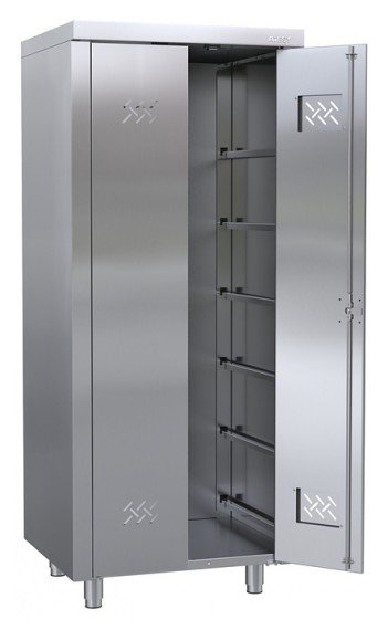 Шкаф ATESY ШЗХ-С-600.600-02-Р серии Стандарт используется на предприятиях общественного питания и торговли для хранения хлеба и хлебобулочных изделий. Модель оснащена распашными дверями с перфорацией и замком. Корпус (кроме дна и задней стенки) выполнен из нержавеющей стали AISI 430, дно и задняя стенка - из оцинкованной стали.