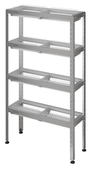 Кухонный стеллаж ATESY СКТ-Б-900-02 серии Бюджет предназначен для хранения тарелок на предприятиях общественного питания и торговли. Модель оснащена кассетами с лотками для сбора жидкости и регулируемыми по высоте опорами. Полки выполнены из нержавеющей стали AIS I430 толщиной 0,8 мм, стойки - из уголка оцинкованной стали толщиной 1,2 мм, съемные кассеты - из прутка крашеной стали толщиной 3 мм, ножки - из нержавеющей стали, основание ножек - из пластика.