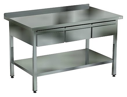 Стол для овощей Кобор СПБЯ-120/70 имеет столешницу изготовленную из высококачественной нержавеющей стали, а также во избежание прогибов укрепленную листом ЛДСП толщиной 16 мм. Стол оснащен ящиками. Каркас стола изготовлен из нержавеющей квадратной трубы 40х40 мм, ножки регулируются по высоте позволяя избежать наклона рабочей поверхности. Товар поставляется в разобранном виде и в упаковке для облегчения транспортировки.