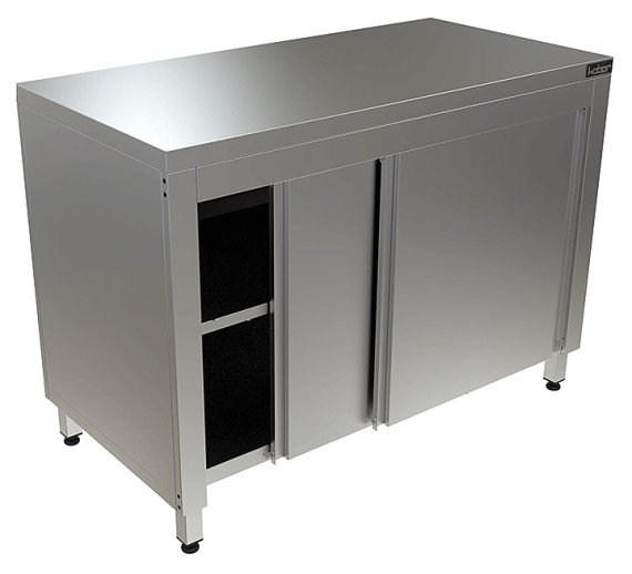 Стол-тумба Кобор СТ-120/60/К произведена из высококачественной нержавеющей стали, что позволяет использовать предмет в различных цехах. Комплектация стола включает в себя двери-купе. Во избежание прогибов столешница усилена листом ЛДСП толщиной 16 мм.