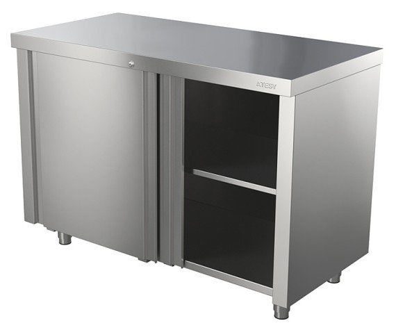 Производственный стол ATESY СТ-С-950.600-02-К используется на предприятиях общественного питания и торговли для разделывания и обработки пищевых продуктов, а также в качестве вспомогательной поверхности для кухонного оборудования и места хранения кухонной посуды, инвентаря и сухих продуктов. Оснащена полкой и 2 дверями типа купе. Дно и задняя стенка выполнены из оцинкованной стали, все остальные элементы - из нержавеющей стали AISI 430 толщиной 0,8 мм, столешница укреплена с внутренней стороны листом ДСП толщиной 16 мм.