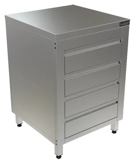 Стол-тумба Кобор СТ/1-60/70 произведен из высококачественной нержавеющей стали, что позволяет использовать предмет в различных цехах. Модель оснащена 4 ящиками. Во избежание прогибов столешница усилена листом ЛДСП. Ножки изделия регулируются по высоте, для исключения проблем с неровным напольным покрытием, предотвращая наклон рабочей поверности. Разборный каркас и столешница выполнены из нержавеющей стали AISI 430.