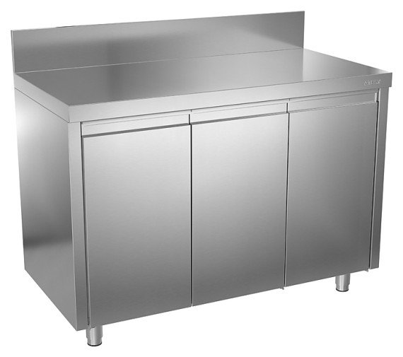 Производственный стол ATESY СТ-С-1.150-1300.600-02-Р-2П серии Стандарт используется на предприятиях общественного питания и торговли для разделывания и обработки пищевых продуктов, а также в качестве вспомогательной поверхности для кухонного оборудования. Модель оснащена 3 распашными дверцами и 2 переставными полками. Изделие выполнено из легированной стали, столешница дополнительно укреплена листом ламинированной древесностружечной плиты с внутренней стороны.