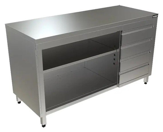 Стол-тумба Кобор СТ/1-100/60/О произведен из высококачественной нержавеющей стали, что позволяет использовать предмет в различных цехах. Модель оснащена полкой и 4 ящиками. Во избежание прогибов столешница усилена листом ЛДСП. Ножки изделия регулируются по высоте, для исключения проблем с неровным напольным покрытием, предотвращая наклон рабочей поверности. Разборный каркас и столешница выполнены из нержавеющей стали AISI 430.