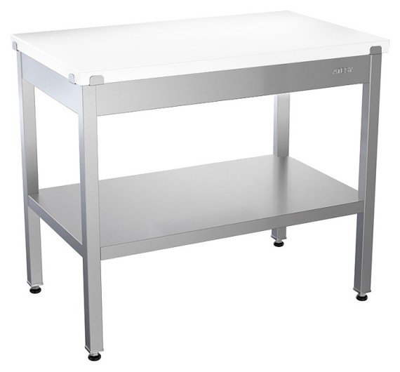 Производственный стол ATESY СРП-Л-1200.600-02 серии Люкс используется на предприятиях общественного питания и торговли для разделывания и обработки пищевых продуктов, а также в качестве вспомогательной поверхности для кухонного оборудования. Столешница выполнена из полипропилена толщиной 30 мм, полка - из нержавеющей стали AISI 304, стойки - из трубы 40х40 мм из нержавеющей стали AISI 304.