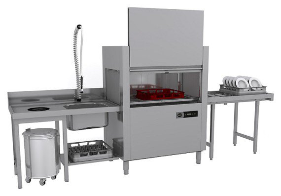 В комплект поставки входят дозаторы, подключение к холодной воде и модуль сушки. Вентилятор вытяжки, накопитель пара, столы для грязной и чистой посуды заказываются отдельно.