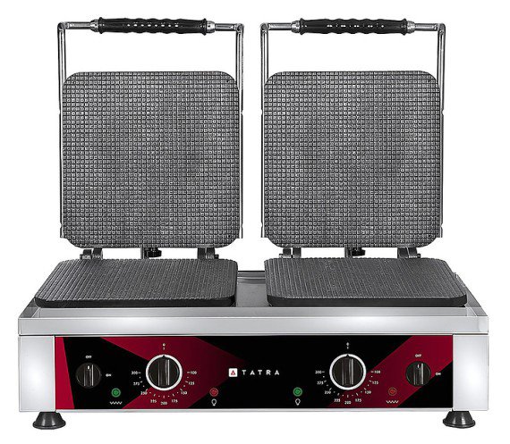 Вафельница Tatra TWI 2 GELATO предназначена для выпечки вафель для рожков на предприятиях общественного питания и торговли. Модель оснащена электромеханической панелью управления с терморегулятором, 2 зонами выпечки с независимым управлением, емкостью для сбора жира и индикаторами питания и нагрева. Корпус выполнен из нержавеющей стали, несъемные рабочие поверхности - из чугуна.