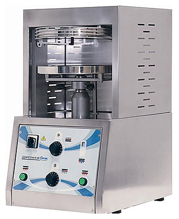 Аппарат оснащен 2 стальными нагревающимися поверхностями, терморегулятором и механическим приводом. Пресс выполнен из нержавеющей стали. Его нижняя пластина оснащена скосом для формирования бортика пиццы.