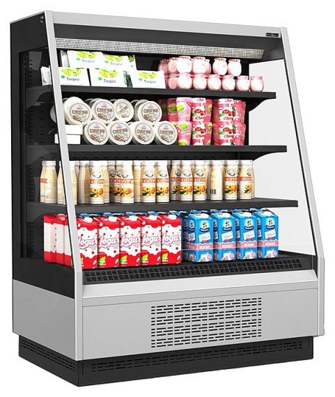Холодильная горка Carboma F 16-08 VM 1,3-2 версия 2.0 серии Tokyo 2 используется на предприятиях общественного питания и торговли для охлаждения, кратковременного хранения и предпродажной демонстрации напитков, мяса, птицы, полуфабрикатов, молочных и гастрономических изделий. Модель оснащена 3 рядами навесных полок с кронштейнами, подставкой с фронтальной термовыводящей и цокольной решетками. Корпус с наклонным фронтом выполнен из стали с антикоррозийным покрытием внешних панелей, полок и кронштейнов серого цвета (RAL 9006), цоколя и интерьера черного цвета (RAL 9005), теплоизоляция – из пенополиуретана.