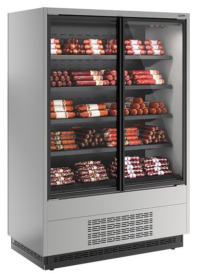 Холодильная горка Carboma FC 20-07 VV 1,3-1 версия 2.0 Standard серии Cube 2 используется на предприятиях общественного питания и торговли для охлаждения, кратковременного хранения и предпродажной демонстрации напитков, мяса, птицы, полуфабрикатов, молочных и гастрономических изделий. Модель оснащена 4 рядами навесных полок с кронштейнами, 2 распашными дверьми с рукоятками по всей длине створок, глухими боковинами с зеркалами на внутренней поверхности, подставкой с фронтальной термовыводящей и цокольной решетками. Корпус прямоугольно ориентированной формы выполнен из стали с антикоррозийным покрытием внешних панелей, полок и кронштейнов серого цвета (RAL 9006), цоколя и интерьера черного цвета (RAL 9005), теплоизоляция – из пенополиуретана.