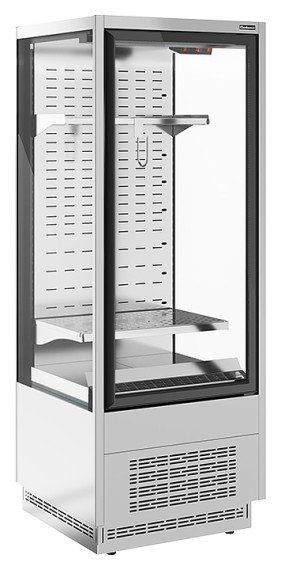 Среднетемпературная холодильная горка Carboma FC 20-07 VV 0,7-1 версия 2.0 Standard серии Сube Flesh 2 используется на предприятиях общественного питания и торговли для кратковременного хранения и предпродажной демонстрации мясной продукции. Модель оснащена навесной перфорированной полкой с кронштейнами, подвесом с крюками для мяса, распашной дверью с рукояткой по всей длине створки, подставкой с фронтальной термовыводящей и цокольной решетками. Корпус прямоугольно ориентированной формы выполнен из стали с антикоррозийным покрытием внешних панелей и интерьера цвета нержавеющая сталь (RAL 0430), теплоизоляция – из пенополиуретана.