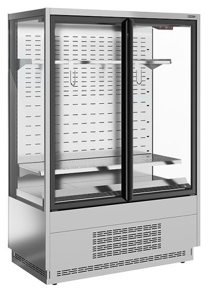 Среднетемпературная холодильная горка Carboma FC 20-07 VV 1,0-1 версия 2.0 Standard серии Сube Flesh 2 используется на предприятиях общественного питания и торговли для кратковременного хранения и предпродажной демонстрации мясной продукции. Модель оснащена навесной перфорированной полкой с кронштейнами, подвесом с крюками для мяса, 2 распашными дверьми с рукоятками по всей длине створок, подставкой с фронтальной термовыводящей и цокольной решетками. Корпус прямоугольно ориентированной формы выполнен из стали с антикоррозийным покрытием внешних панелей и интерьера цвета нержавеющая сталь (RAL 0430), теплоизоляция – из пенополиуретана.