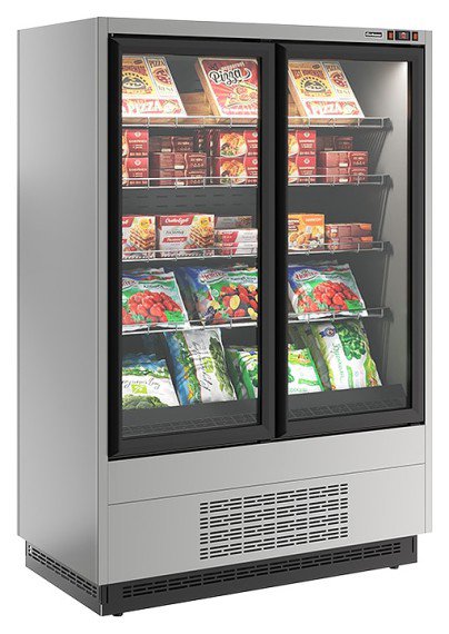 Морозильная горка Carboma FC 20-07 VL 1,0-1 версия 2.0 Standard серии Cube 2 используется на предприятиях общественного питания и торговли для кратковременного хранения и предпродажной демонстрации мяса, птицы и другой замороженной продукции. Модель оснащена 4 рядами навесных решетчатых полок с ограничителями, 2 распашными дверьми с рукоятками по всей длине створок, глухими боковинами, подставкой с фронтальной термовыводящей и цокольной решетками. Корпус прямоугольно ориентированной формы выполнен из стали с антикоррозийным покрытием внешних панелей и полок цвета нержавеющая сталь (RAL 0430), цоколя и дверных рам черного цвета (RAL 9005), теплоизоляция – из пенополиуретана.