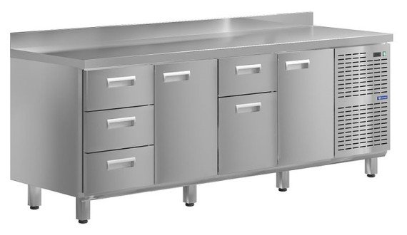 Морозильный стол KAYMAN KСМ-3141/60 предназначен для охлаждения, хранения и обработки пищевых продуктов в ресторанах, барах, кафе, столовых, на профессиональных кухнях и пищевых производствах. На прочной столешнице можно резать, раскатывать и отбивать полуфабрикаты. Модель оснащена 5 ящиками и 2 дверьми. Изделие выполнено из высококачественной нержавеющей стали, отличающейся прочностью и долговечностью.