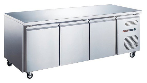 Морозильный стол Tatra TRTGN3 BT предназначен для хранения замороженных ингредиентов и готовых блюд на предприятиях общественного питания и торговли. Модель оснащена встроенным холодильным агрегатом с боковым расположением, цифровым термостатом, 3 глухими самозакрывающимися дверьми с магнитным уплотнителем и 4 колесами, 2 из которых со стопором. Корпус и столешница выполнены из высококачественной нержавеющей стали.