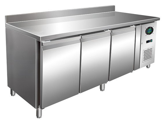 Морозильный стол VIATTO GN3200BT предназначен для обработки, охлаждения, заморозки и длительного хранения пищевых продуктов на предприятиях общественного питания и торговли. Модель оснащена расположенным сбоку агрегатным отсеком, электронным термостатом, столешницей, 3 морозильными камерами с распашными дверьми, 3 полками для гастроемкостей, устойчивыми опорами, кабелем питания и панелью управления с цифровым дисплеем. Корпус и столешница выполнены из высококачественной нержавеющей стали.