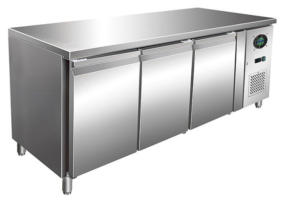 Морозильный стол VIATTO GN3100BT предназначен для обработки, охлаждения, заморозки и длительного хранения пищевых продуктов на предприятиях общественного питания и торговли. Модель оснащена расположенным сбоку агрегатным отсеком, электронным термостатом, столешницей, 3 морозильными камерами с распашными дверьми, 3 полками для гастроемкостей, устойчивыми опорами, кабелем питания и панелью управления с цифровым дисплеем. Корпус и столешница выполнены из высококачественной нержавеющей стали.