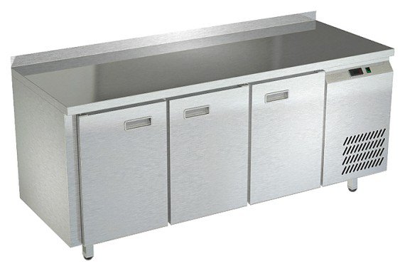 Морозильный стол Техно-ТТ СПБ/М-221/30-1806 предназначен для раскатки теста, обработки, заморозки и долговременного хранения продуктов, полуфабрикатов, напитков и мороженого на предприятиях общественного питания и торговли. Модель оснащена 3 секциями с 3 дверьми и регулируемой полкой-решеткой, петлями-доводчиками (Польша), бортом и круглыми ножками, регулируемыми по высоте на 50 мм (Италия). Корпус и столешница выполнены из нержавеющей стали AISI 430, задняя стенка и дно - из оцинкованной стали.