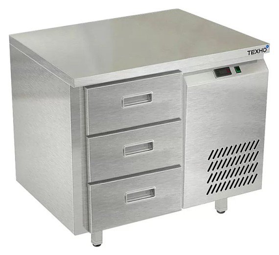 Морозильный стол Техно-ТТ СПБ/М-123/03-906 предназначен для раскатки теста, обработки, заморозки и долговременного хранения продуктов, полуфабрикатов, напитков и мороженого на предприятиях общественного питания и торговли. Модель оснащена 1 секцией с 3 ящиками, направляющими с доводчиками (Австрия) и круглыми ножками, регулируемыми по высоте на 50 мм (Италия). Корпус и столешница выполнены из нержавеющей стали AISI 430, задняя стенка и дно - из оцинкованной стали.