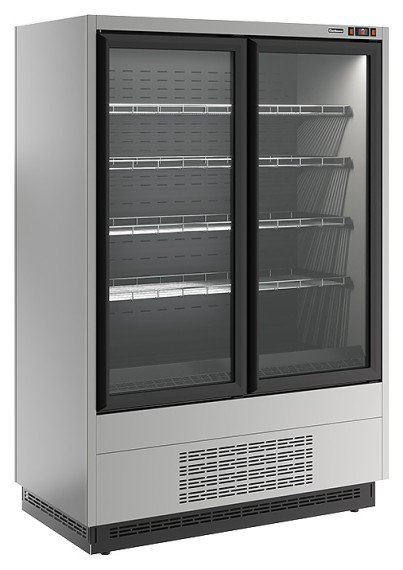 Морозильная горка Carboma FC 20-07 VL 1,0-1 версия 2.0 Standard серии Cube 2 используется на предприятиях общественного питания и торговли для кратковременного хранения и предпродажной демонстрации мяса, птицы и другой замороженной продукции. Модель оснащена 4 рядами навесных решетчатых полок с ограничителями, 2 распашными дверьми с рукоятками по всей длине створок, глухими боковинами, подставкой с фронтальной термовыводящей и цокольной решетками. Корпус прямоугольно ориентированной формы выполнен из стали с антикоррозийным покрытием внешних панелей и полок серого цвета (RAL 9006), цоколя и дверных рам черного цвета (RAL 9005), теплоизоляция – из пенополиуретана.