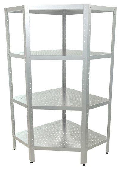 Угловой кухонный стеллаж Кобор СКПУ-3/5-100/80 предназначен для хранения посуды, различного инвентаря и сухих продуктов на предприятиях общественного питания и торговли. Модель оснащена перфорированными полками. Разборный каркас выполнен из уголка из оцинкованной стали, полки - из нержавеющей стали AISI 430.