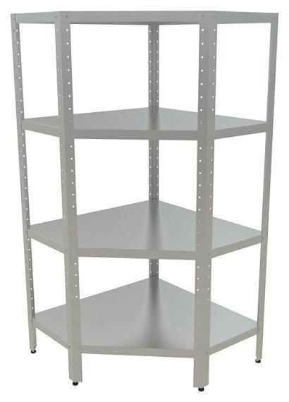 Угловой кухонный стеллаж Кобор СКУ-4/3-90/100/430 предназначен для хранения посуды, различного инвентаря и сухих продуктов на предприятиях общественного питания и торговли. Модель оснащена сплошными полками. Разборный каркас выполнен из уголка из нержавеющей стали AISI 430, полки - из нержавеющей стали AISI 430.