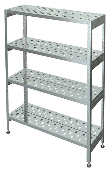 Решетчатый стеллаж Марихолодмаш С-4Р-0,4/1,2/1,8 предназначен для хранения посуды и кухонных принадлежностей в горячих и холодных цехах, на предприятиях общественного питания и торговли. Полки с отверстиями диаметром 40 мм для слива воды выполнены из нержавеющей стали AISI 430 толщиной 0,5 мм, ножки с регулируемыми опорами из уголка 40х40 мм из оцинкованной стали толщиной 1 мм с подгибом краёв во внутрь.