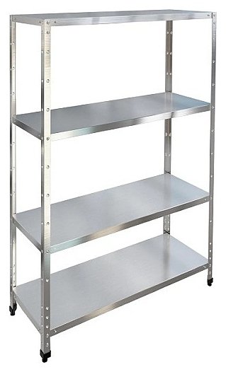 Кухонный стеллаж Restoinox СТП-9/3-ЭЦ предназначен для хранения посуды, инвентаря и продуктов, не требующих специального температурного режима, на предприятиях общественного питания и торговли. Модель оснащена 4 регулируемыми по высоте сплошными полками и ребрами жесткости. Разборный каркас выполнен из уголка 40х40 мм оцинкованной стали, ребра жесткости и полки - из нержавеющей стали AISI 430.