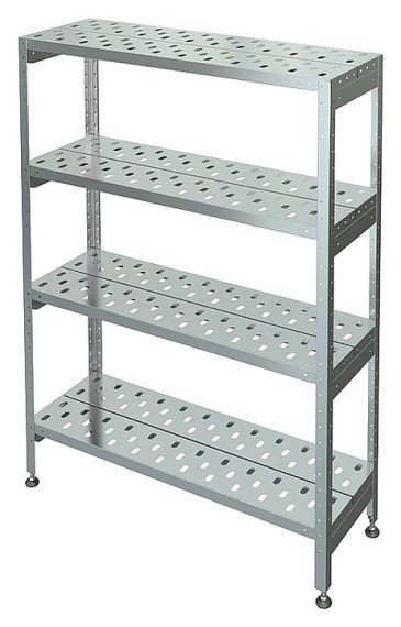 Стеллаж Марихолодмаш С-4Р-0,5/1,5/1,6 предназначен для хранения кухонного инвентаря и упакованных пищевых продуктов с целью увеличения полезного пространства помещений на предприятиях общественного питания в моечных отделениях, складских помещениях и в холодильных камерах. Полки с округлыми отверстиями для слива воды выполнены из нержавеющей стали AISI 430 толщиной 0,5 мм и усилены швеллером, стойки - из оцинкованного стального уголка, ножки с регулиремыми опорами - из оцинкованного стального уголка 40х40 мм с подгибом краёв во внутрь толщиной 1 мм.