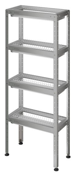 Стеллаж ATESY СКТС-Б-650-02 серии Бюджет предназначен для хранения тарелок и стаканов на предприятиях общественного питания и торговли. Модель оснащена кассетами с лотками для сбора жидкости и регулируемыми по высоте опорами. Полки выполнены из нержавеющей стали AIS I430 толщиной 0,8 мм, стойки - из уголка оцинкованной стали толщиной 1,2 мм, съемные кассеты - из прутка крашеной стали толщиной 3 мм, ножки - из нержавеющей стали, основание ножек - из пластика.