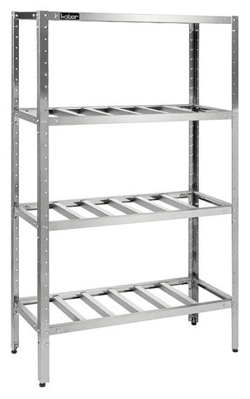 Стеллаж Кобор СКР-90/50 предназначен для хранения посуды, кухонной утвари и сухих продуктов на предприятиях общественного питания, торговли и в промышленно-производственных помещениях. Каркас выполнен в виде уголка 40х40 мм из оцинкованной стали, решетчатые полки - из нержавеющей стали AISI 430. Уникальная система крепления полок обеспечивает жёсткость конструкции стеллажа.