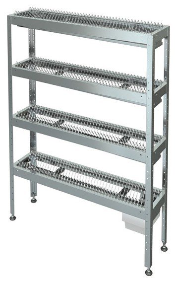 Стеллаж Марихолодмаш С-5т-0,3/1,2/1,8 предназначен для размещения, хранения и сушки в естественных условиях стандартных суповых и десертных тарелок различных диаметров в моечных отделениях и складских помещениях на предприятиях общественного питания и торговли. Полки выполнены из нержавеющей стали AISI 430 толщиной 0,5 мм, стойки - из нержавеющего стального уголка, ножки с регулируемыми опорами - из нержавеющего стального уголка 40х40 мм с подгибом краёв во внутрь толщиной 1 мм, решетка - из проволоки диаметром 5 мм.