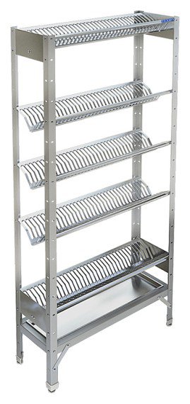 Стеллаж Техно-ТТ СТР-615/603 предназначен для сушки и кратковременного хранения чистых тарелок на предприятиях общественного питания и торговли. Модель оснащена поддоном для сбора жидкости и регулируемыми по высоте полками и ножками, что позволяет компенсировать неровности пола. Разборный каркас выполнен из стального уголка 40х40 мм толщиной 2 мм, покрытого порошковой краской, кассеты для тарелок - из нержавеющей стали AISI 430, поддон - из нержавеющей стали AISI 304.