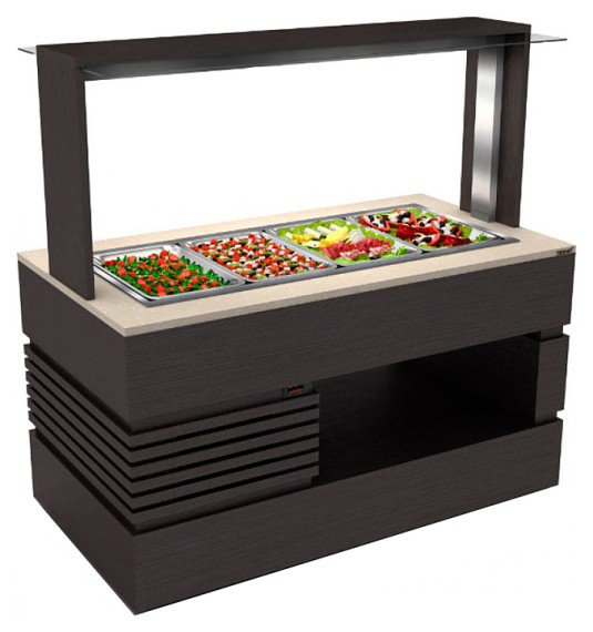 Буфет Техно-ТТ БОВ-104/966ДН предназначен для выкладки, кратковременного хранения и раздачи салатов и холодных блюд на предприятиях общественного питания и торговли. Модель оснащена центральной полкой с подъемным механизмом и подсветкой и направляющими под подносы. Каркас выполнен из оцинкованной стали, фасад - из шпона и МДФ, столешница - из искусственного камня.
